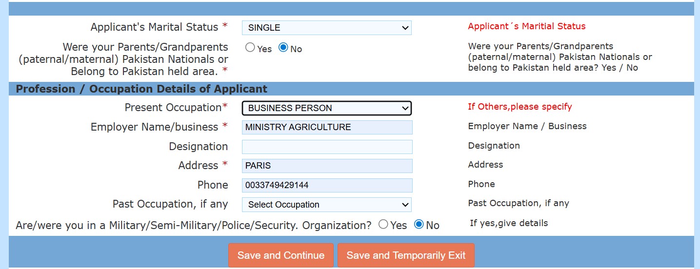 2- Renseigner selon les besoins – ici exemple pour 1an de Visa- :