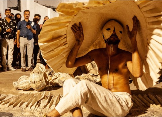 Cette année, la Biennale est confiée à Nikhil Chopra, artiste goanais, roi de la performance lente, maître du mélange dessin + théâtre + costume + installation.